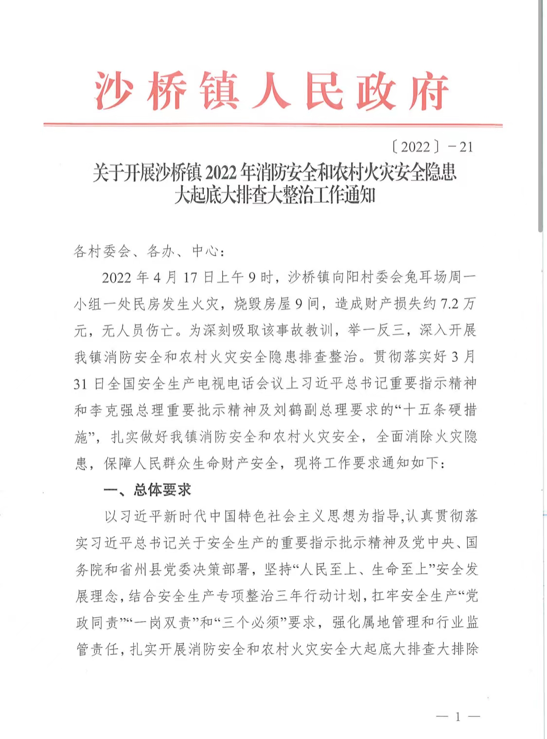【安全生产工作】本周,为扎实做好我镇消防和农村火灾安全防控工作,全面消除火灾隐患,保障人民群众生命财产安全,沙桥镇制定印发了《关于开展沙桥镇2022年消防安全和农村火灾安全隐患大起底大排查大整治工作的通知》,沙桥镇将在4月18日至28日期间在全镇范围内开展2022年消防安全和农村火灾安全隐患大起底大排查大整治工作。
