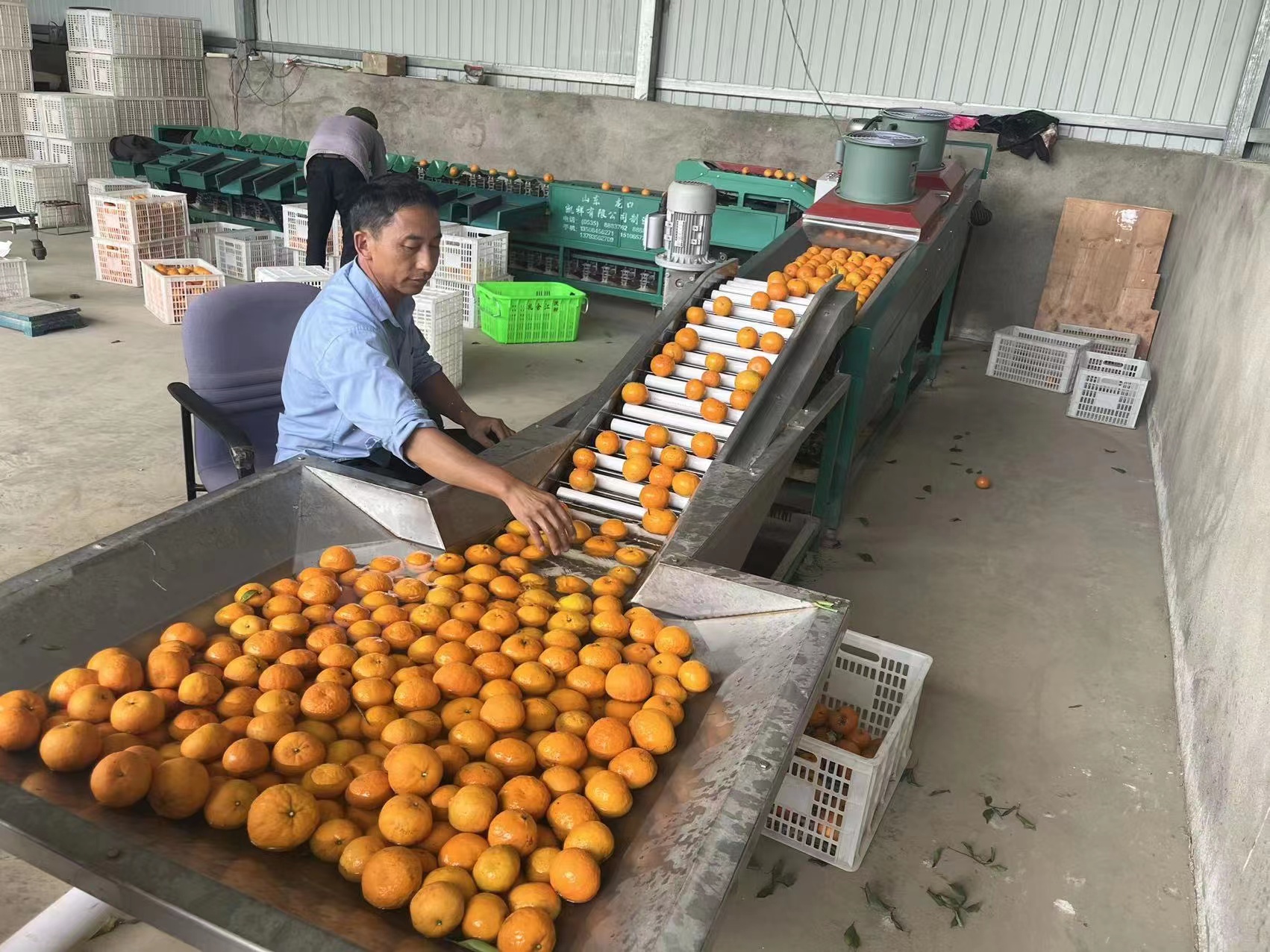 随后罗彩江将刚从枝头采摘下的沃柑表皮擦拭后,小心放在分拣器上,由机器自动分拣后,根据沃柑大小进行打包装箱。