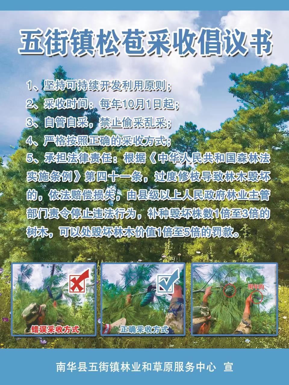 2022年,针对松苞采收中不规范、无序等问题,五街镇持续加大松苞规范采收宣传力度,坚持可持续开发利用的原则,重点从采收的时间(10月1日起采收)、采收的方法做出规范,严厉打击偷采乱采等违法行为,坚决制止“一刀砍”的采摘方式,留足下一年松苞幼果,坚决遏制松花粉的采摘及破坏华山松植株,充分保障松苞的产量和质量。通过宣传引导群众科学有效进行产业发展,通过退耕还林等生态修复的方式,鼓励群众利用荒山荒地种植华山松,在进行绿美工程的同时鼓起群众的钱袋子。
