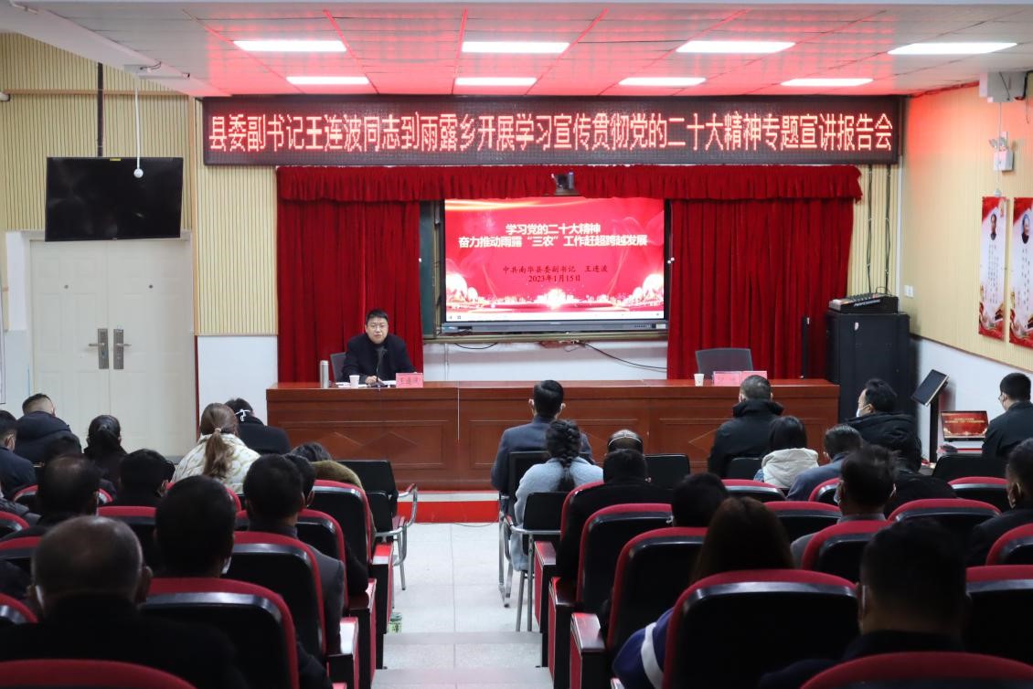 1月15日,县委副书记王连波深入联系乡镇雨露乡,为全乡干部职工和村四职干部等宣讲党的二十大精神。他强调,要以党的二十大精神为统揽,坚持农业农村优先发展,巩固拓展脱贫攻坚成果,全面推进乡村振兴,奋力实现农业更强、农村更美、农民更富。