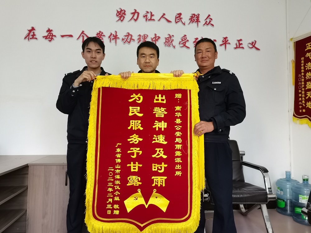 农历正月十五这天,雨露派出所民警收到了一个陌生快递。“元宵节也不兴着送礼物呀”,带着疑惑,民警们打开了包裹,发现竟是一面锦旗,上面写着“出警神速及时雨为民服务予甘露”,署名是广东省佛山市谭淑仪。