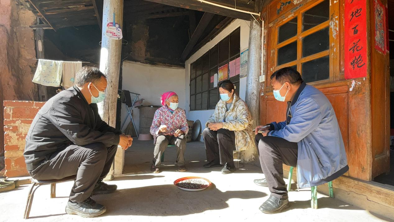 (雨露白族乡党委副书记、政法委员,雨露司法所长,村级调解员到脱贫户家中讲解危房改造相关政策)
