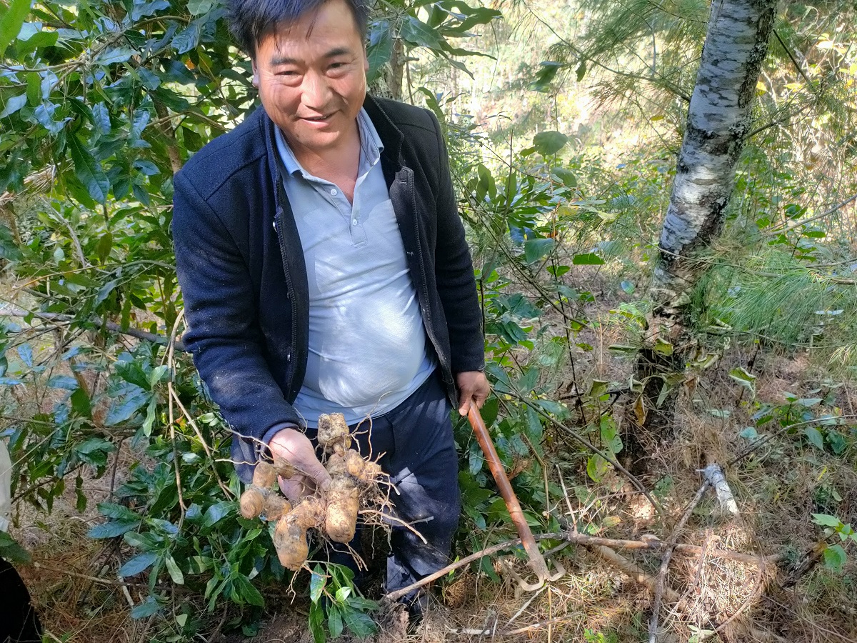 走进依黑么村的万亩华山松林,起荣才正拿着锄头埋头苦干,经过一番努力,茁壮的黄精纷纷被挖掘出来,抖抖土,一颗颗粗壮形似生姜的黄精露出真容。