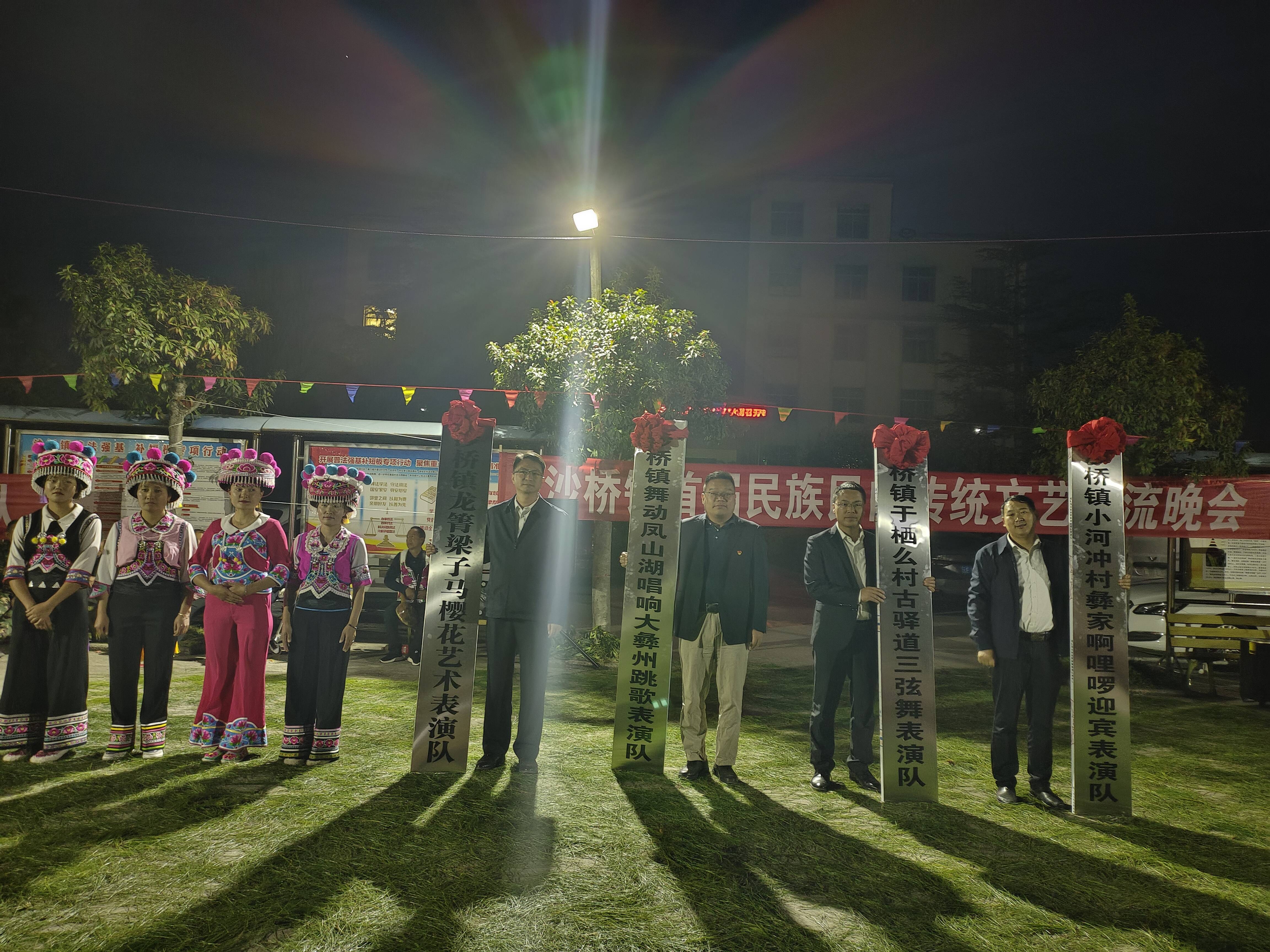 3月19日晚,沙桥镇开展首届民族传统文艺交流晚会,本次晚会邀请了沙桥本土4支跳歌表演队,并在会上进行了授牌仪式。晚会节目内容丰富,形式多样,包括山歌对唱、左脚舞等群众喜闻乐见的节目。节目主要围绕爱党爱国、歌颂新生活等内容,演出中,现场观众频频用雷鸣般的掌声表达对节目的喜爱之情。