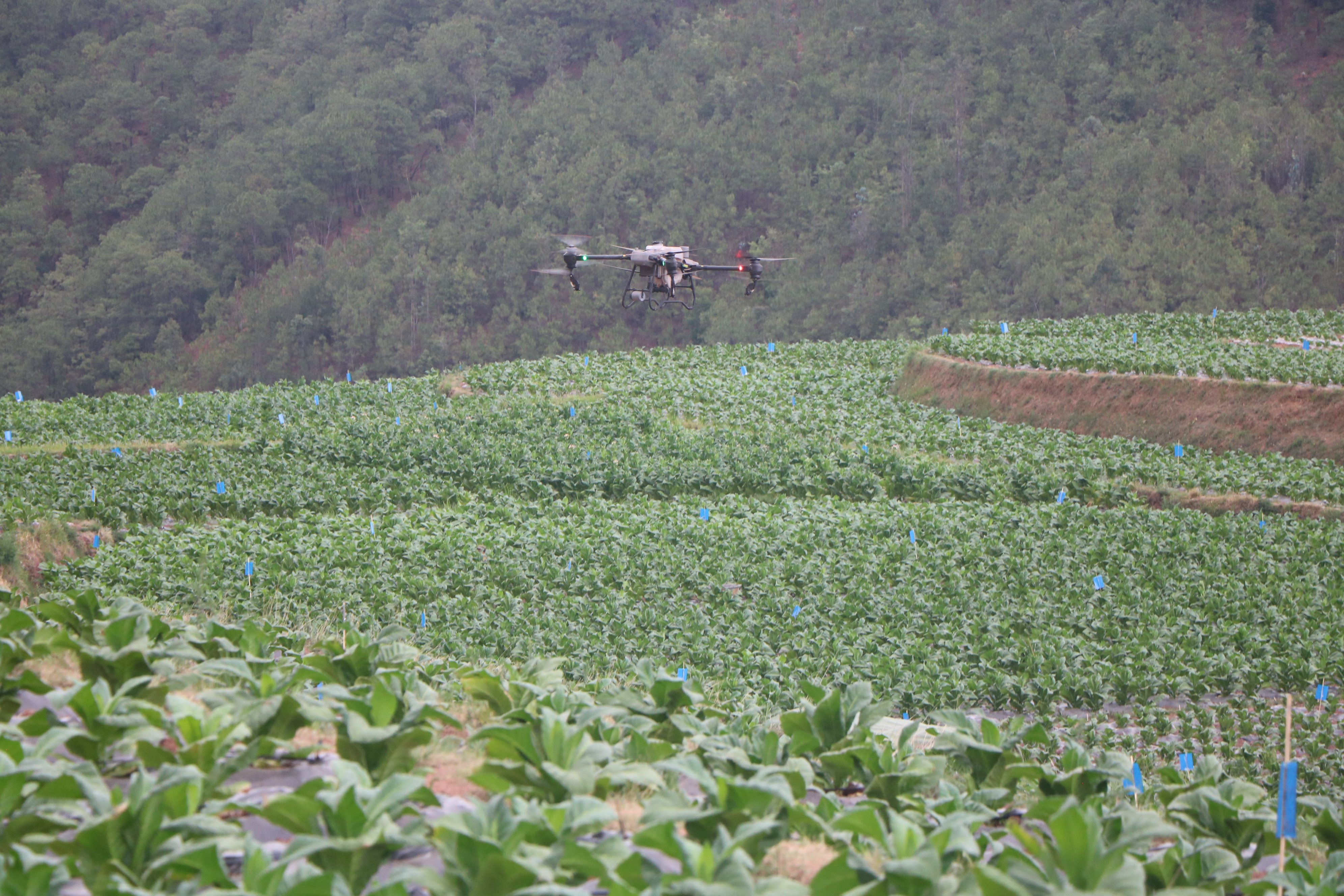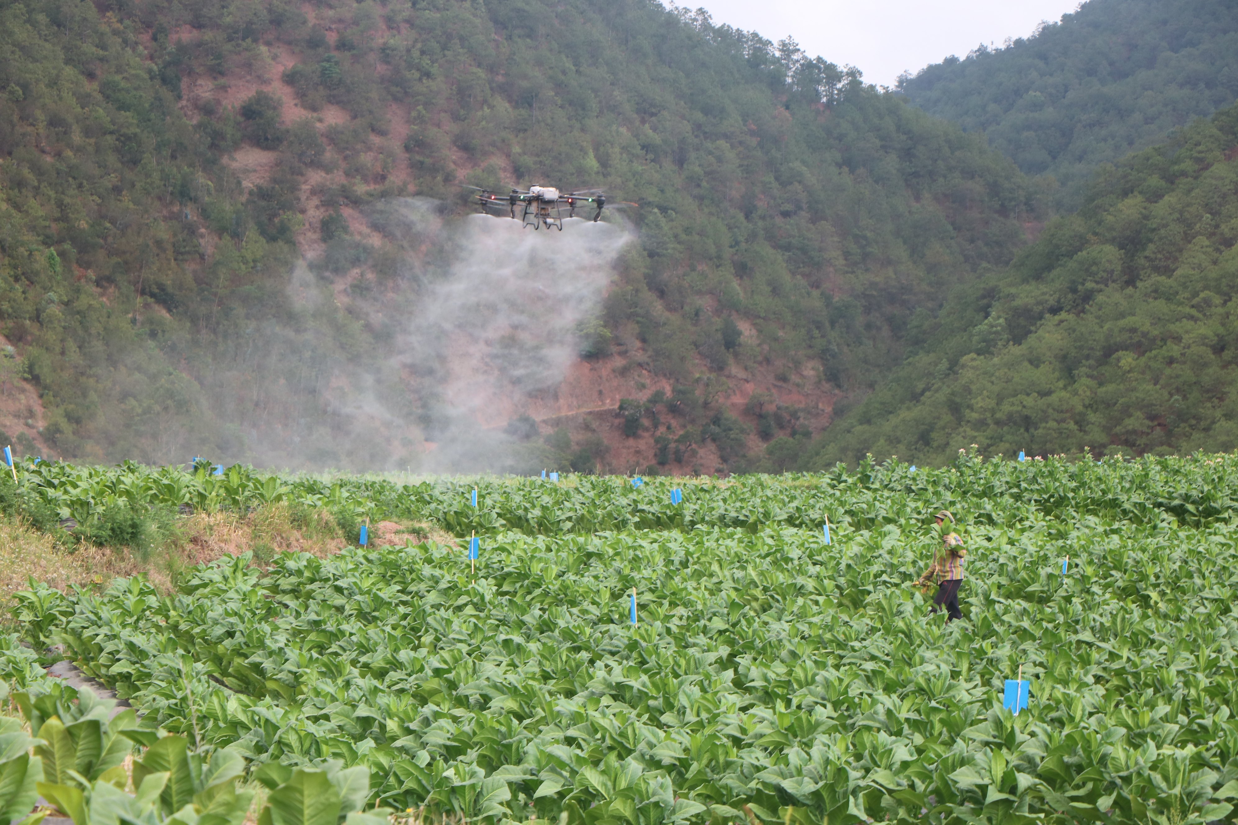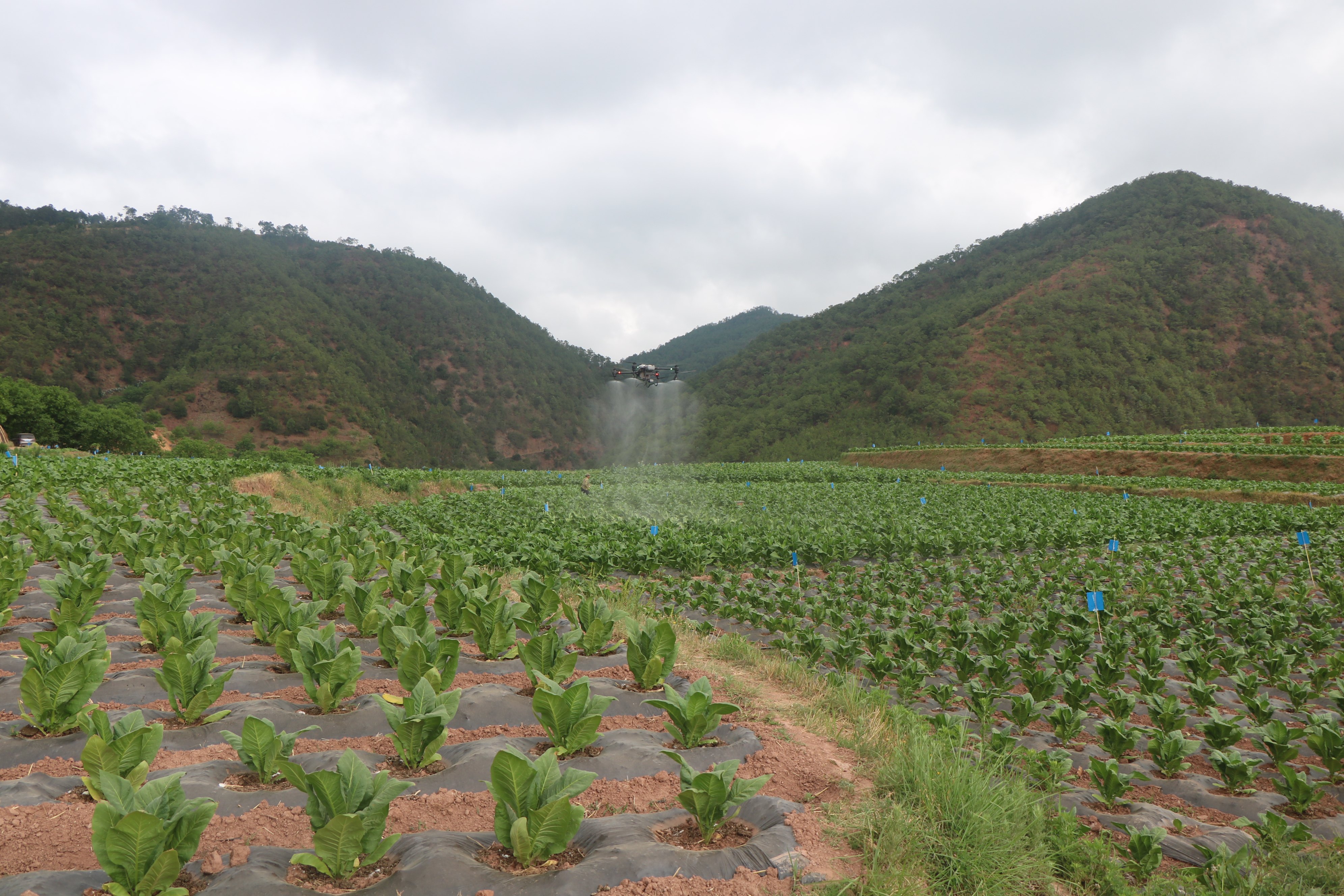 走进南华县五街镇迤黑地村委会段家小组,在层层叠翠的烟田上空,一架无人机在技术人员的操作下,穿梭于烤烟田上空,只见雾化的农药随着无人机的移动,均匀地喷洒在烟叶上。