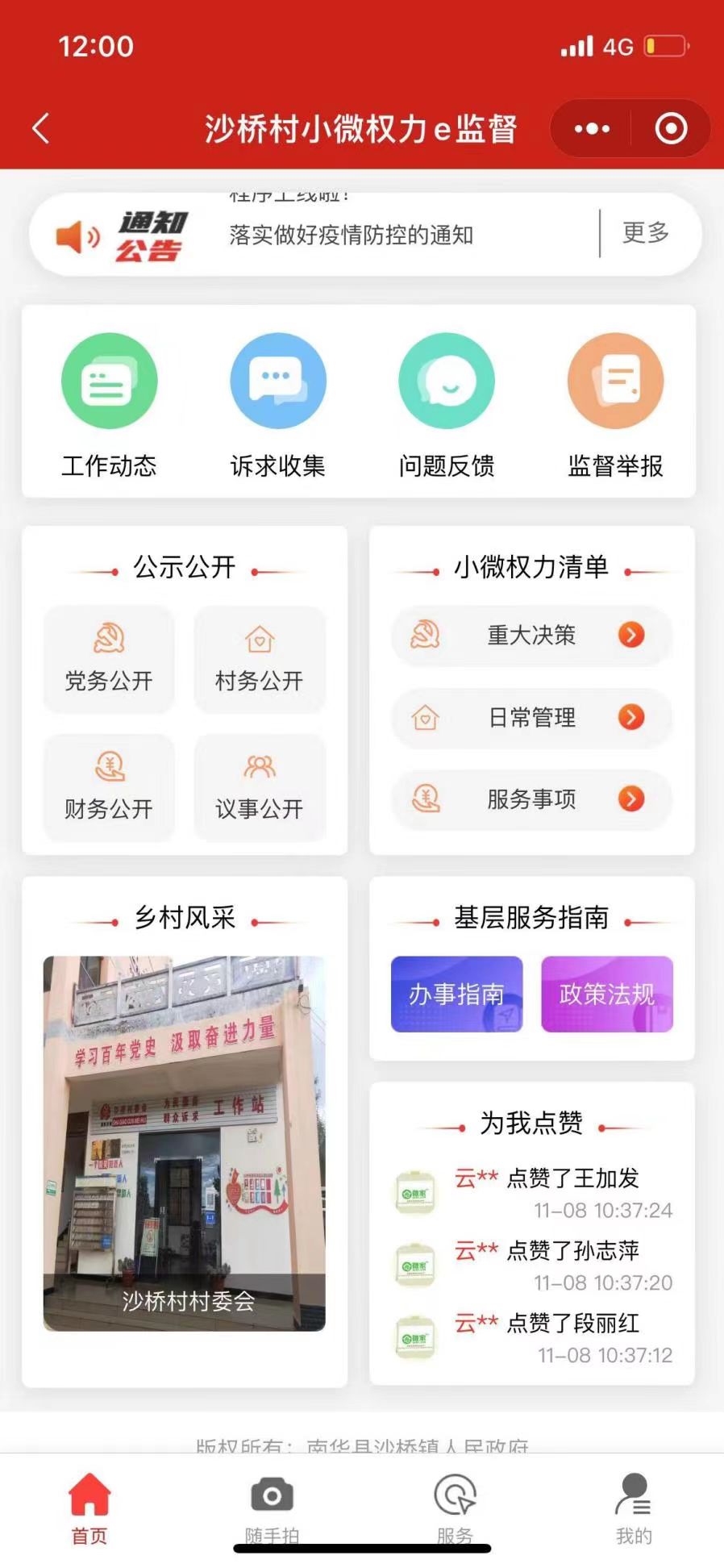另外一个“1”是指以全方位监督为抓手,搭建一平台,让担子挑得稳。在推广好云南省小微权力“监督一点通”的同时,采用镇带村的模式,搭建“清廉沙桥”宣传监督平台,让群众可以随时随地通过微信小程序在线上查阅镇村工作情况,力争做到群众足不出户,尽知全镇大小事。自2022年10月平台上线以来,已在平台公开事项367项,平台访问次数超3.6万多人次,现已成为沙桥镇抓实“三公开”和畅通群众诉求的重要手段。