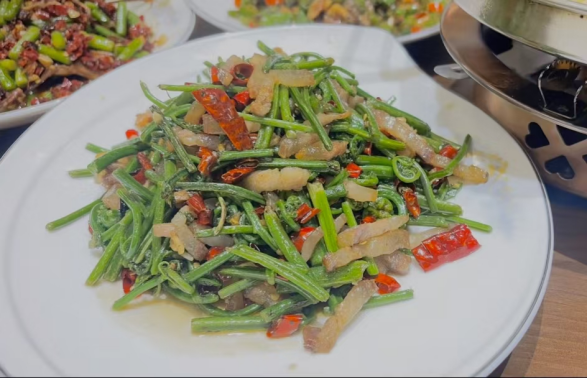 在烟火氤氲的灶台间,承载着当地人对美食的热忱与智慧。红土坡人的一双双巧手,总能将山林间鲜嫩的蕨菜,幻化为千般滋味,使之成为地方饮食文化的鲜明代表。当浓郁咸香的烟熏腊肉,遇上新鲜蕨菜的清甜脆嫩,一场味觉的盛宴便在猛火爆炒中激情上演。腊肉醇厚的油脂香气,瞬间点燃了蕨菜的山野清新,山野气息与人间烟火巧妙的完美交融,成为餐桌上令人赞不绝口的独特美味;而经沸水焯烫、清水浸泡,褪去自身青涩后的嫩蕨,佐以蒜末的辛香、辣椒的热辣、香醋的酸爽等简单调味,摇身一变成为消暑开胃的佳品,入口瞬间,蕨菜的爽滑甘洌在舌尖上肆意舞动,清爽之感直沁心脾;还有那融合了蚕豆、本地老火腿厚片与新鲜蕨菜段同煮的佳肴。在慢火温柔的煨煮下,锅中汤色渐呈乳白,火腿的醇厚、蚕豆的粉糯、蕨菜的鲜嫩,共同谱写出一曲滋味醇厚且层次丰富的美味乐章,当之无愧成为红土坡人家餐桌上的时令至鲜。