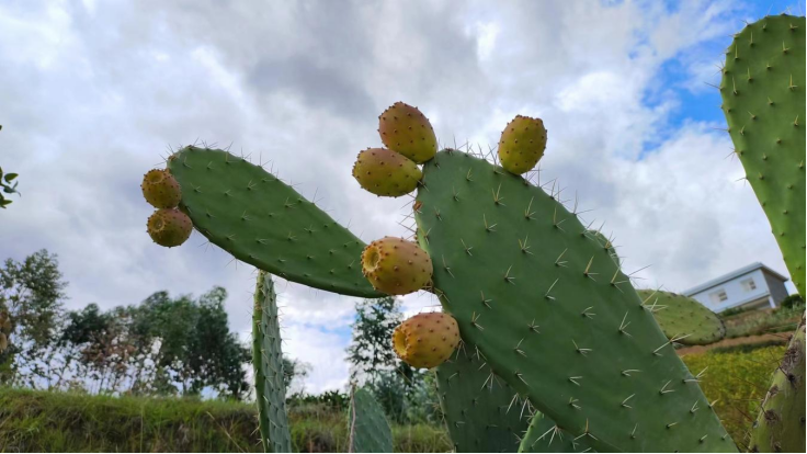 仙人掌是明末时期被引种到中国的,每年4月开花,花瓣或红或黄或粉或白,经过盛夏阳光的洗礼,8月果实成熟,仙人果又叫人参果、莲菜花、延寿果。《本草纲目拾遗》记载:“仙人掌味淡性寒,有清热解毒、消肿止痛,活气血,健脾止泻的作用,多于药用。”仙人掌叶片能吃,果实也能吃,仙人掌果含有丰富的微量元素、蛋白质、氨基酸、维生素、多糖类、黄酮类和果胶等,是一种高蛋白、低脂肪、低糖、高膳食纤维的水果。