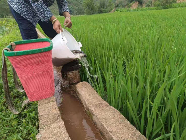 领到鱼苗的农户们用水桶将鱼苗陆续投放进稻田里,技术人员向村民们详细讲解稻渔共养的种养技术,按照技术规范指导农户实施投放鱼苗等田间工程,并耐心解答村民提出的疑问。“感谢党和政府的关心,想方设法增加老百姓的收入,带领我们发展产业,不仅能免费领到鱼苗,还有技术员教我们如何养好鱼,到稻谷丰收的时候,谷子有了,鱼也得了,真真切切实现双丰收。”村民李永龙一脸喜悦地说。