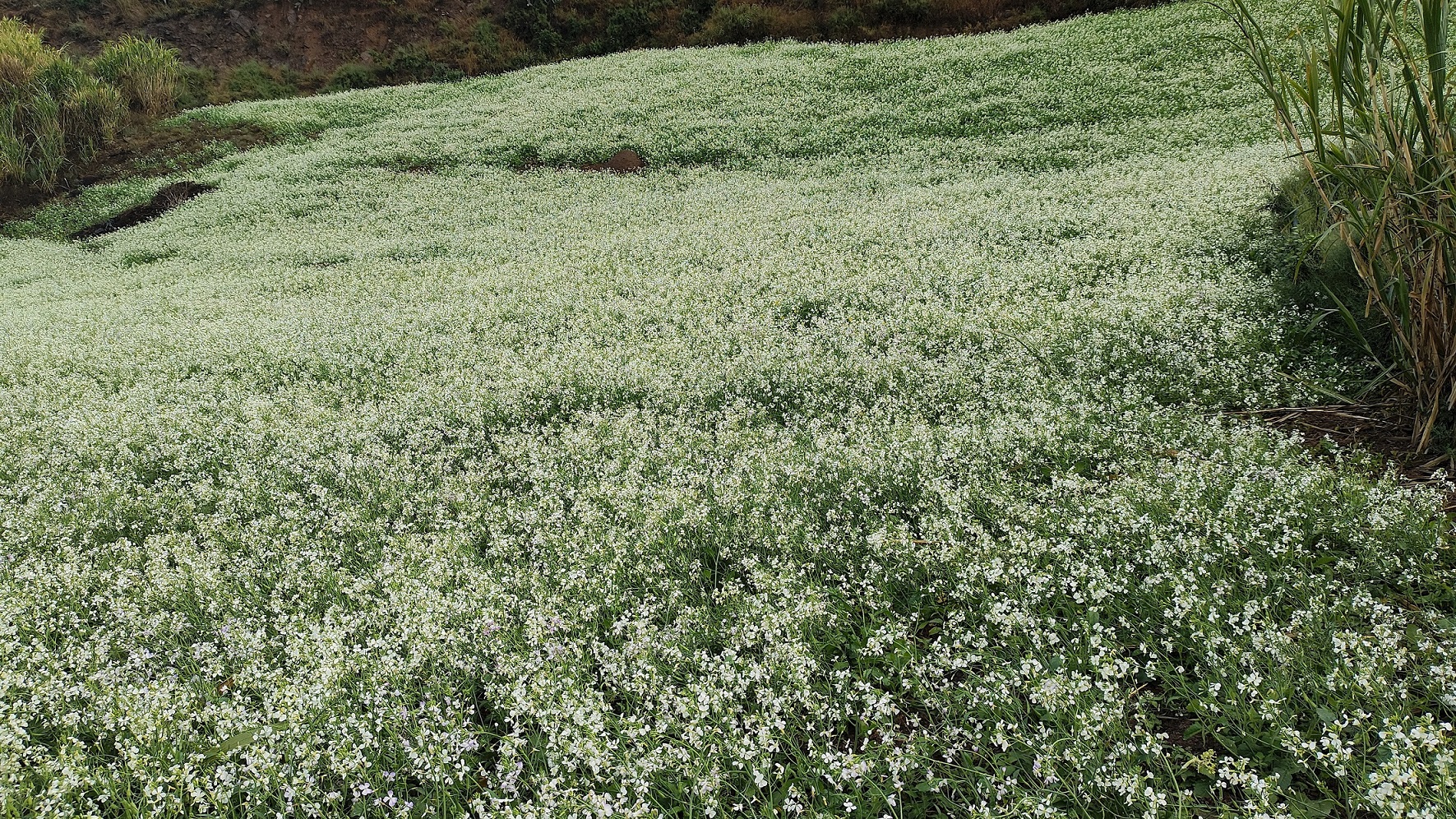 团山村成片萝卜地里的萝卜已经抽苔,已长到半人多高,远远望去,好像是给冻结的大地铺上了一层绿油油的毯子,孕育着新的生机,其间还点缀着许多紫白色的小花,点点花朵下,又藏着一个个形似小葫芦的萝卜籽荚。