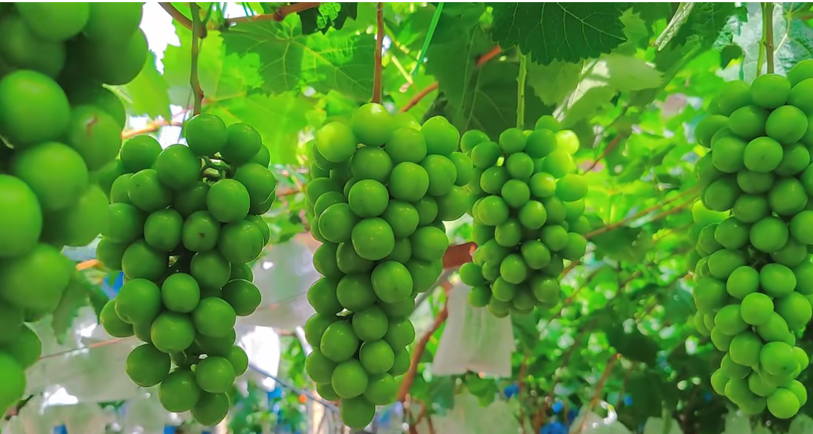 该基地的负责人李之洪正和工人对葡萄进行疏果或摘叶心,以保证每串葡萄品质上乘。“阳光玫瑰”葡萄成熟时果粒呈现出清凉的绿色,甜度高、果实脆、香味似玫瑰,它满足了人们“吃葡萄不吐葡萄皮”的美好愿望,轻薄的果皮可以轻松入口、不苦不涩,被称为果中“新贵”,深受消费者的喜爱。