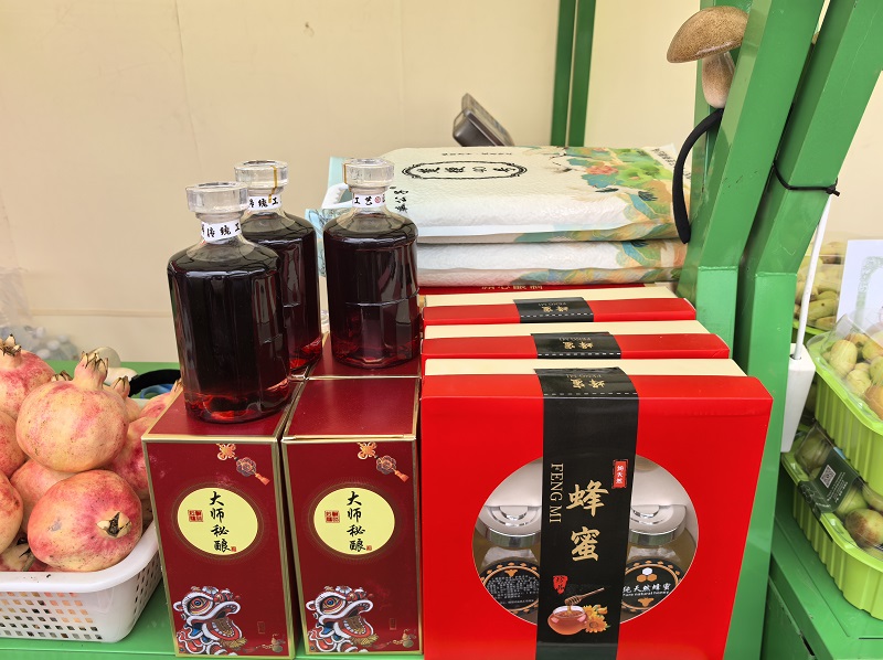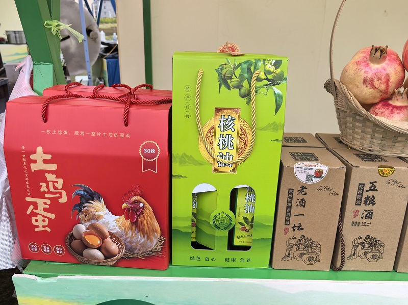 紧挨着水果的蜂蜜展位更显精致,精美的礼盒包装里装着原生态的蜂蜜。用木勺舀起一勺,琥珀色的蜜液缓缓滴落,空气中瞬间弥漫开甜润的香气。展销人员现场冲了几杯蜂蜜水,游客们抿一口,清甜从舌尖润到喉咙,不少人当即定下了几盒。除了蜂蜜,一旁的五粮酒也凭借醇厚的酒香,收获了大批粉丝。核桃油与土鸡蛋摆在显眼处,核桃油透着浅黄,旁边竹篮里的鸡蛋带着自然斑点,展销人员正给顾客装袋:“这油是自家核桃榨的,给小孩吃最有营养;鸡蛋是也是散养的鸡下的,你看这蛋黄多黄啊。”游客们纷纷接过袋子,原生态的产品总是能抓住消费者的心,谁都想吃上一口自然风味。