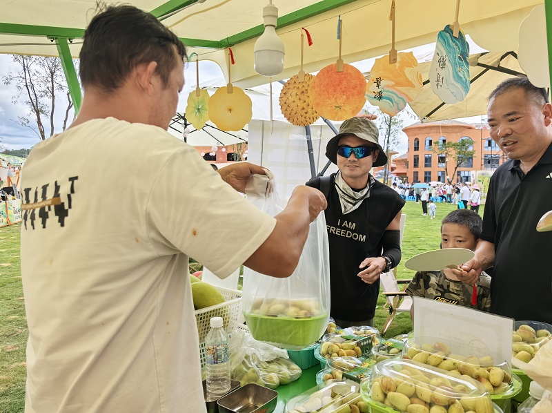 一街的展位上,刚摘下的水果堆成了小山。阳光晒透的石榴泛着红晕,拨开一个,石榴籽晶莹剔透;硕大的青芒散发的淡淡芒果清香,咬一口汁水四溢;还有一蓝篮高钙小枣,鲜脆清甜的滋味足以满足味蕾。“这些都是咱团山村果园里的,不催熟、不打蜡,还有国家绿色食品认证哦,咱吃的就是这口新鲜。”果农朱辅章一边给试吃的游客递上切好的果块,一边笑着说。