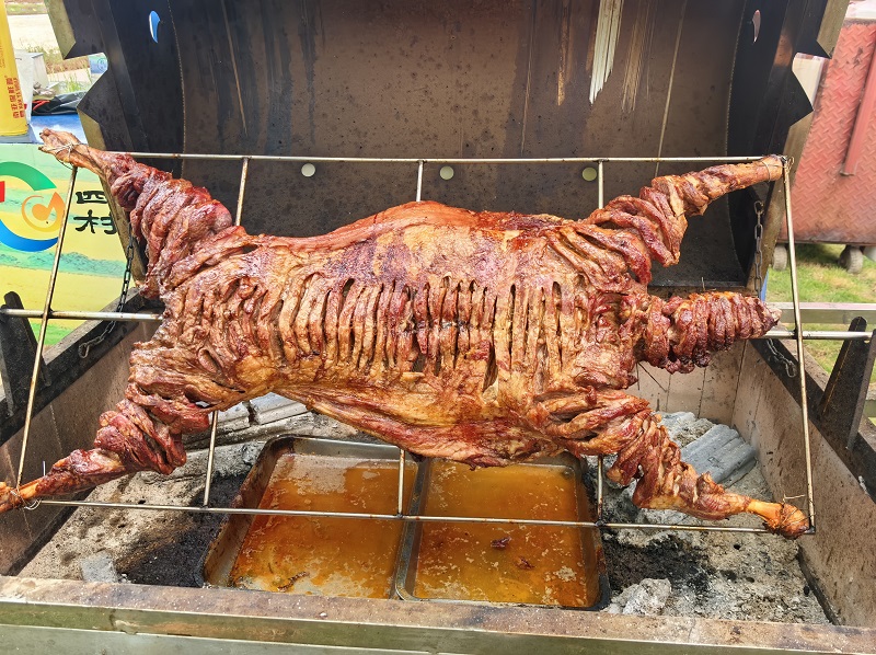 拐角处的烟火最盛,展位前人头攒动。烤全羊架在炭火上,表皮烤得金红油亮,师傅握着长柄刀,片下的肉卷着热气,混着孜然与芝麻的香,引得排队的人直抻脖子。旁边的烤炉上,羊肉串滋滋冒油,肥瘦相间的肉块烤得焦香,火星子偶尔溅起,映得摊主额头的汗珠发亮。小锤干巴摆在烤架上,深褐色的肉条泛着油光,有人拿起一根嚼着,越嚼越觉咸香漫开来,忍不住又抓了一把。