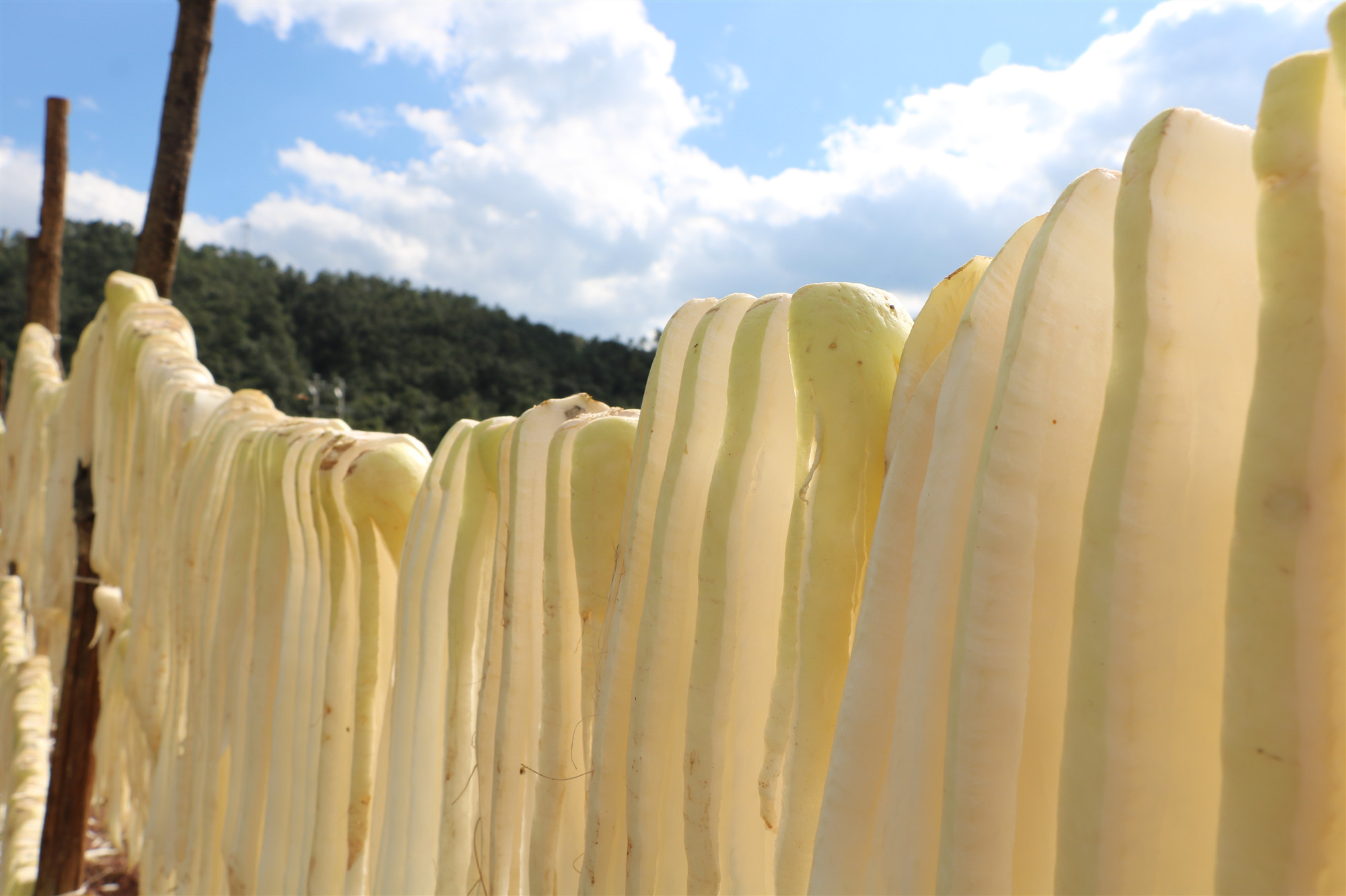 除了个大脆甜的鲜食萝卜,晒萝卜条也是冬日的一道靓丽风景线。在五街镇的田间地头,蔓延的绿色上,还有一排排雪白的干萝卜条正沐浴在阳光下。