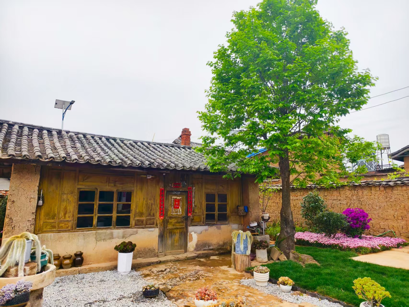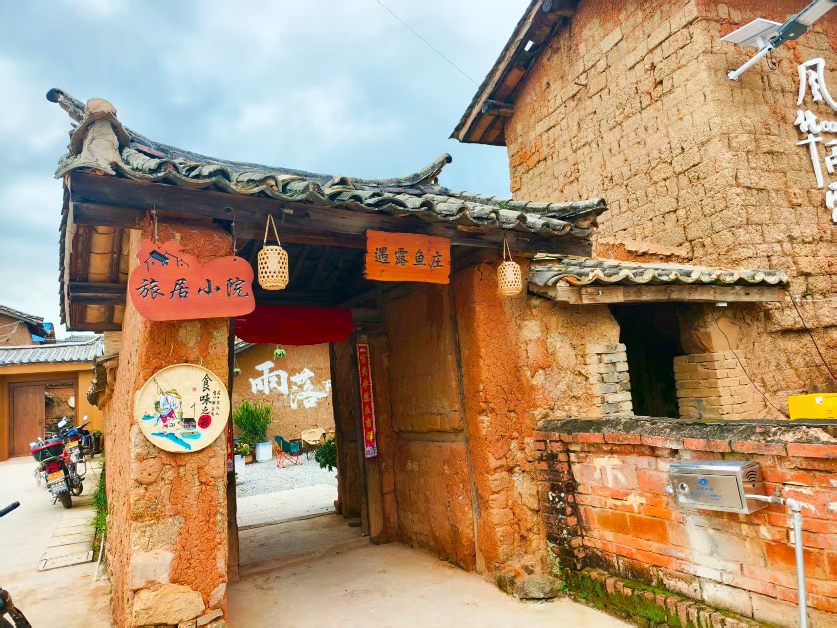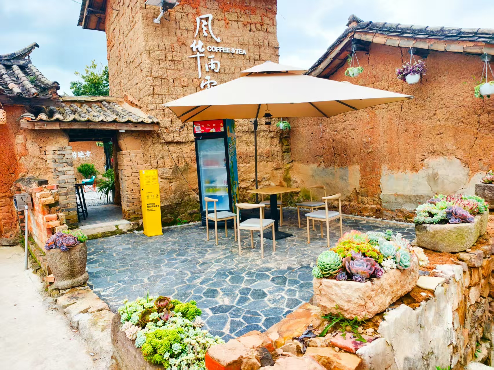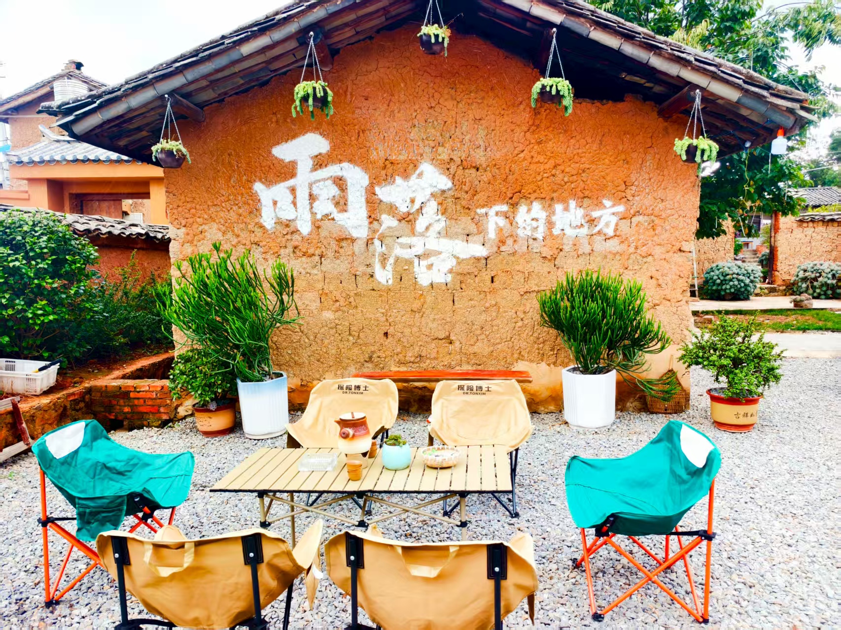 村子的围墙在太阳下是淡黄色的、在细雨里是橙褐色的,长年的风吹雨打,让土坯墙坑坑洼洼,徒手摸上去是年代的味道。村口的自助售卖机和咖啡桌是原来的老猪圈改造而成的,把猪槽从猪圈里挪出放在半墙上,栽上生命力旺盛的多肉,一把户外遮阳伞、一把椅子,外省游客在遮阳伞下一躺就是一下午。杨松浩把自家的小院取名“遇露鱼庄”,寓意“遇见雨露,如鱼得水”,推开“遇露鱼庄”的大门,映入眼帘的是几个白色的楷体大字“雨落下的地方”,大字的下面是三五好友约着泡一壶茶或磨一罐咖啡,你说你的电影、我讲我旅游、他发他的呆,如此“时光静止,互不打扰”。坐在院里,闻着庭中的香樟树独特味道,看着树冠的影子随着阳光一点点移动,树后紧闭的厨房门仿佛还能看见老奶奶忙碌的样子。院里有餐桌、有茶具,有人喝茶、有人吃烤肉,小小的一方小院里,烟火满人间。运气好时,还能听见远处山顶传来的白族小调。