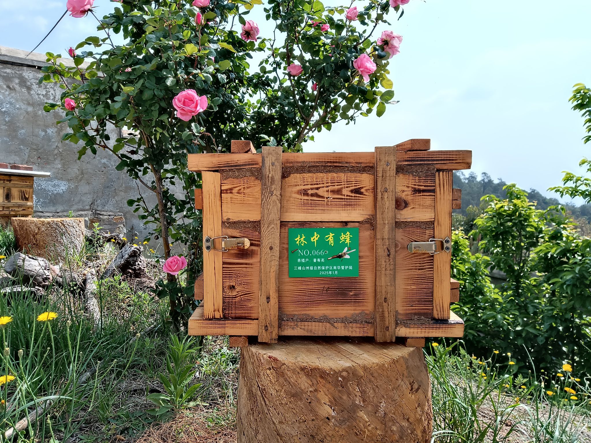 “一般用青松和罗汉松作为蜂箱的原材料,围长40厘米,宽35厘米,高25厘米,木板厚度3.5厘米。在引蜂王筑巢之前要提前将蜂箱消毒再将蜂蜡均匀涂抹在蜂箱内部,这样90%以上都会成功”。普有亮介绍。