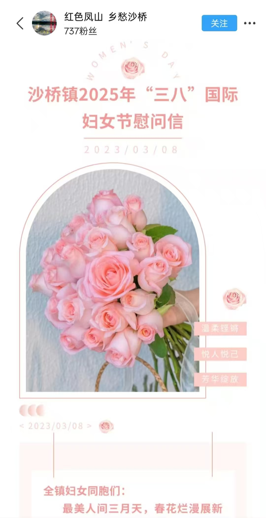送出一封暖心“三八”妇女节慰问信。在第115个“三八”国际妇女节到来之际,沙桥镇通过七彩云端APP送出一封暖心的“三八”国际妇女节慰问信,向全镇各族各界妇女致以节日的祝贺和美好的祝愿。