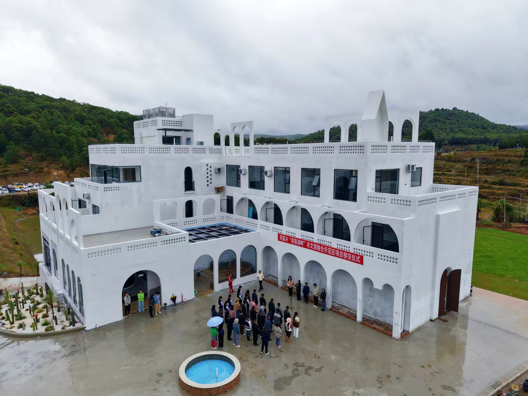 远眺“雨露湖畔”农文旅融合示范区,隔着耐桥的烟雨,圣托里尼风格的山间民宿,仿佛一杯纯酿的酒,伴随着山间的绿开出纯白的花,在异域风情中的多姿多彩。项目运营后,将吸引更多的游客游玩、旅居雨露。