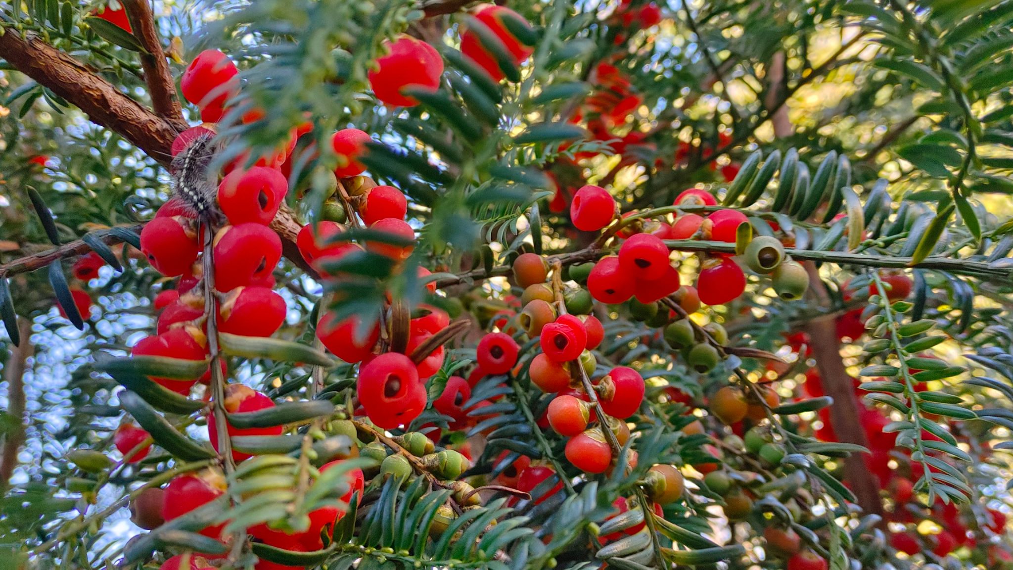 深入林间时,就会发现大风垭口除了让人震撼的绿色外,还藏着些许红色,这红色就是国家一级保护植物红豆杉,它被誉为“植物活化石”,树干挺拔,枝叶苍翠,每一道年轮都记录着一街山川的变迁。红豆杉枝叶四季常青,而到了秋冬时节,镶嵌于绿叶丛中的红豆便全都探出了脑袋,如珊瑚、似玛瑙,成为了万绿丛中星星点点的红,默默地向人们展示着一街生态环境的纯净。