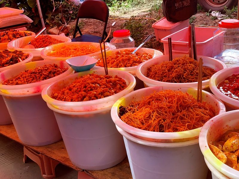 目光所及,更是一片斑斓。卖衣裳的摊子上,挂满了当季最时兴的花色;一旁的铁器摊前,老师傅正弓着腰,“噌噌”地磨着一把剪刀,那声音沉稳而富有节奏,像是在为整个集市打着拍子。再往前走,就是充满“舌尖诱惑”的小吃摊位:酸甜可口的手打柠檬茶、酥脆焦香的烤鸡腿、麻辣爽口的炸洋芋……让人垂涎欲滴。