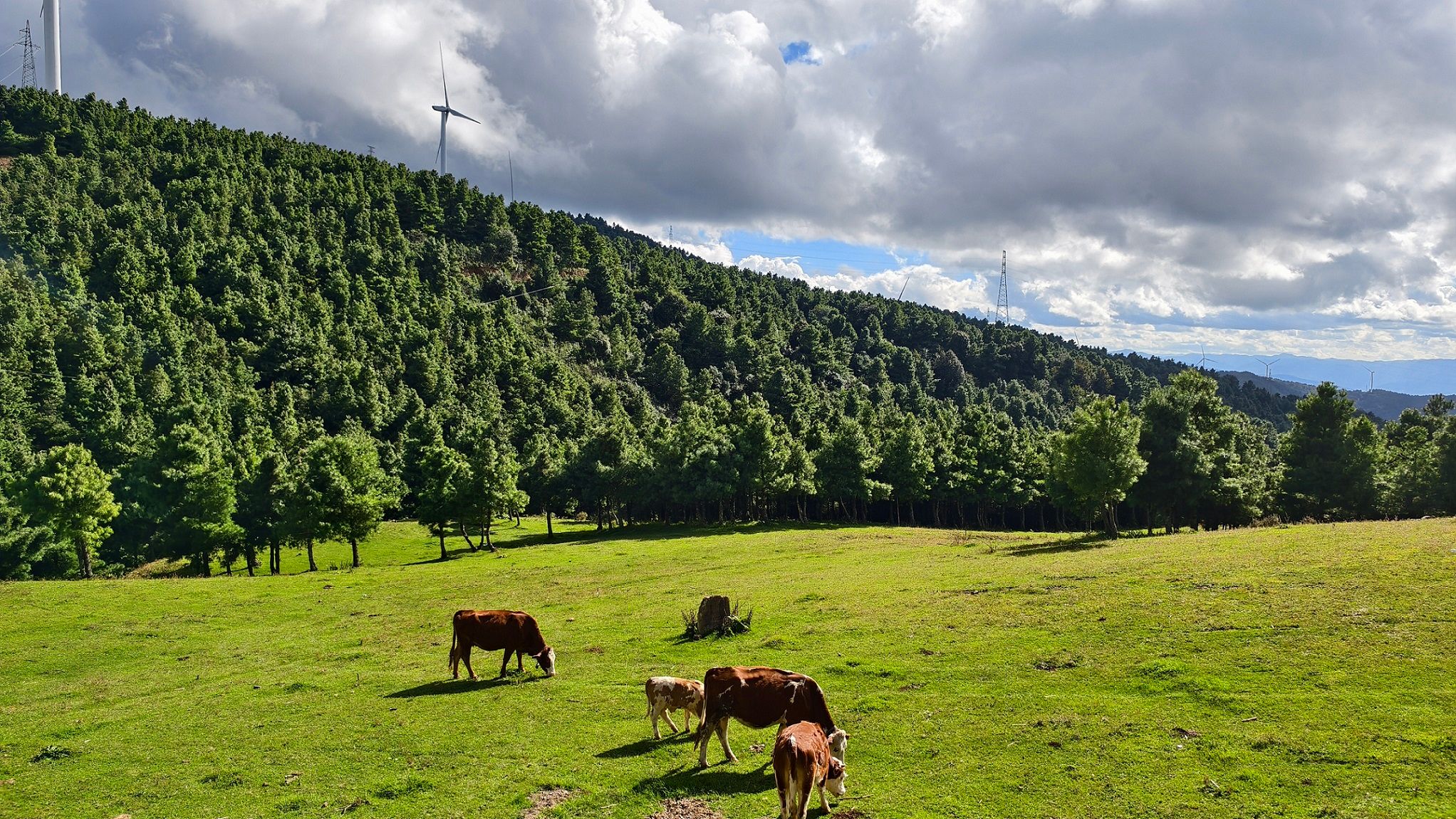 走进一街乡的草场,仿佛闯入了一片“滇中草原”。绿油油的草地如绒毯般铺展,几头黄牛或低头啃食青草,或悠闲踱步,尾巴轻甩间,把时光都晃得慢了下来。