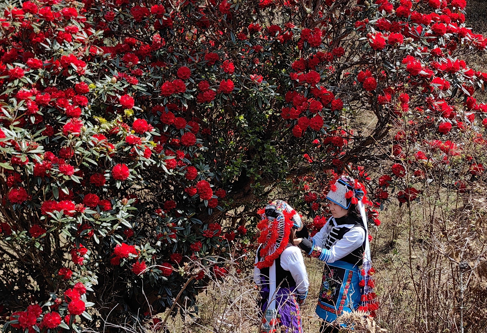 漫步在哀牢山间,马缨花一枝枝、一簇簇,争奇斗艳,点缀在山峦之间,与青山绿树交相辉映,令人心旷神怡。每年的春天,身着彝族服饰的青年男女都会相约而来,赏花、打卡、拍照。绚丽的民族服饰与火红的马缨花相映成趣,构成了一幅“人花相映”的醉人画卷,仿佛将春天的美好定格在了这一刻。