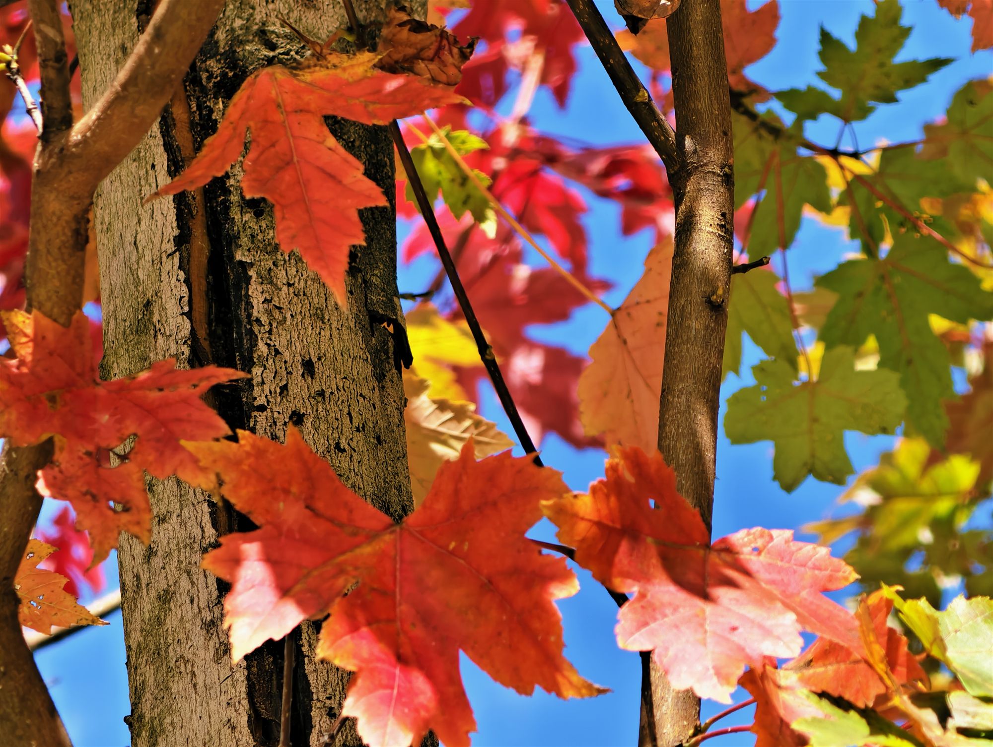 最惊艳是那色彩的盛宴——向阳处是炽烈的朱红,背光处沉淀为醇厚的绛紫,而那些将落未落的,边缘已镶上灿金,像是岁月留下的温柔吻痕。风起时,它们不再仅仅是飘零,而是以优雅的弧线完成与枝梢最后的舞蹈,旋落间在地上铺就斑斓的织锦。这沙沙的脆响,是秋天最动听的絮语。