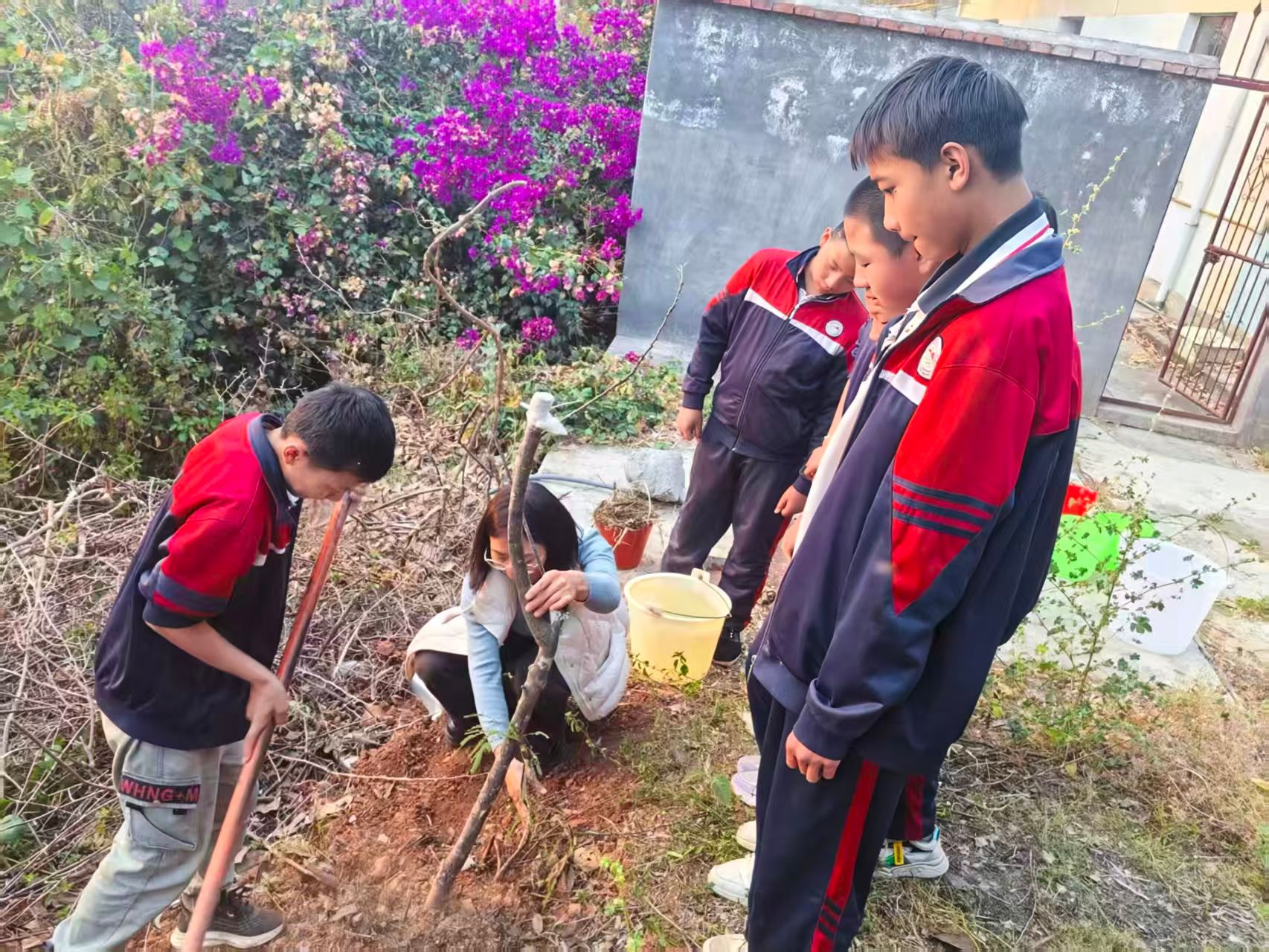 夕阳西下,活动渐入尾声。各班师生在自己打造的劳动成果前合影留念,校园恢复了宁静,但那一株株新栽的橄榄树、一方方平整的菜地、一处处修剪一新的花木,都在无声地诉说着这一天的故事。