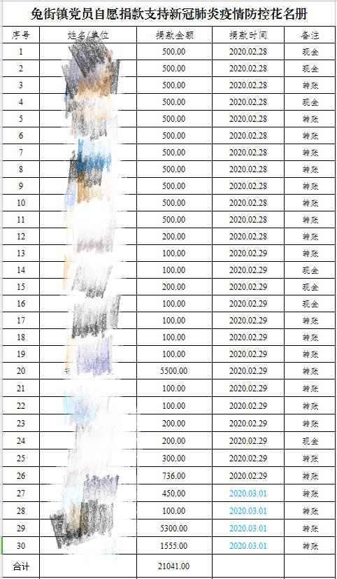 截至3月1日下午,镇村136名党员共捐款21041元,目前捐款仍在有序进行中。