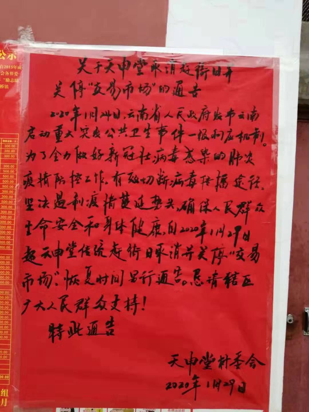 ——市场监管到位。加强辖区内宾馆、饭店、超市、农贸市场,集镇交易场所等的监管,做好疫情传达,防控措施的宣传。从1月26日起,沙桥、天申堂集镇14个宾馆均已关停;农贸市场一律禁止活禽交易;从1月28日起对集镇12个露天水果交易摊点,对宾馆、饭店、超市全面告知经营者必须定期消毒和从营人员、进店人员佩戴口罩的防控措施。同时,全镇共排查出计划在2月份举办自助宴席18起,经过安排村委会人员入户做好解释说明工作,均已签订自愿取消农村自办宴席承诺书。