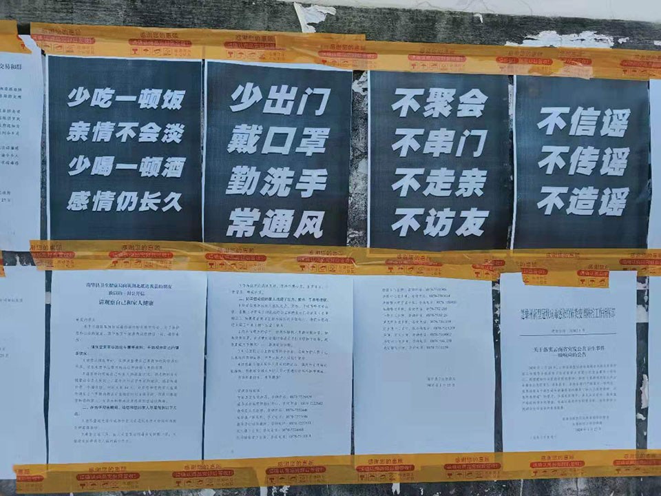 截至目前,发放《致罗武庄乡广大人民群众一封信》14000余份、张贴宣传标语170余条,通过各村“大喇叭”全天候播放宣传防疫小知识及南华县20条措施有关事项通告。目前,该乡暂停辖区内集镇一切市场交易、取消群众自办宴席、取消全乡范围内庙会活动、暂停宾馆、饭店营业,未发现群众传谣、造谣和群众恐慌现象。