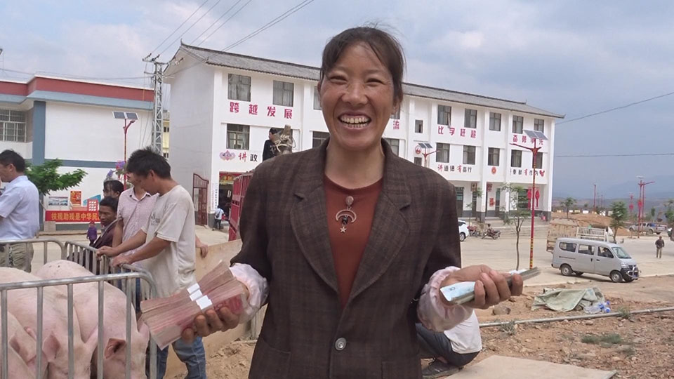 树密鲊村委会罗武庄村村民周建香:今天卖了九个猪,卖得四万贰仟几钱,这几天他们外地呢来收生猪呢只收着28元一(公)斤,这下卖31元一(公)斤卖得四万几是比他们来收生猪呢那种卖高起来四仟多块钱,非常高兴了这下。