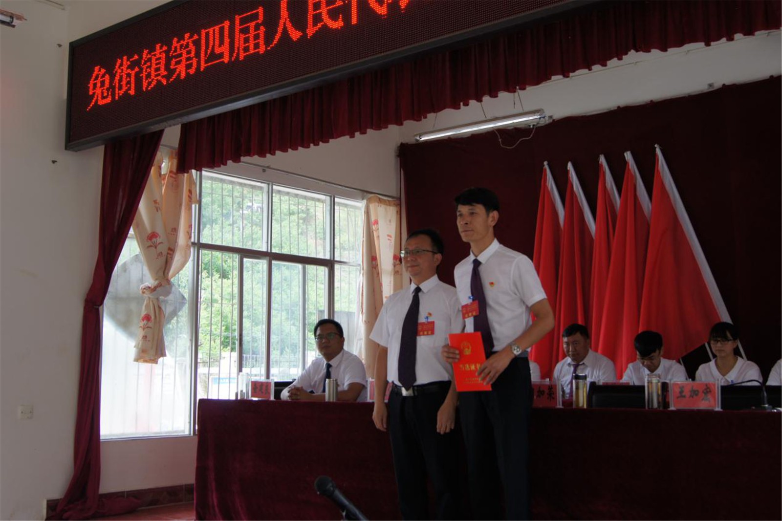 镇党委书记阳加荣同志向新当选镇长颁发当选证书