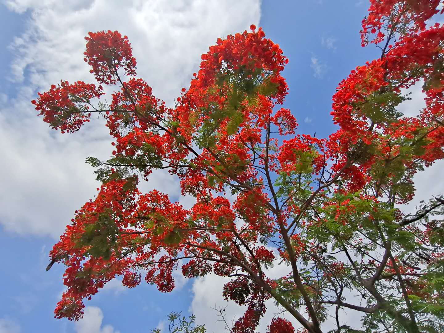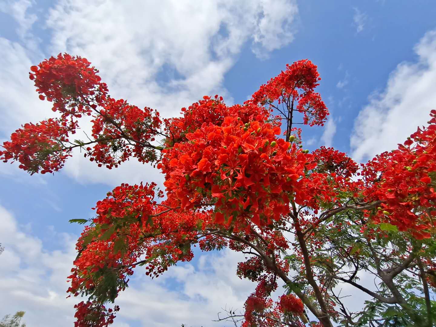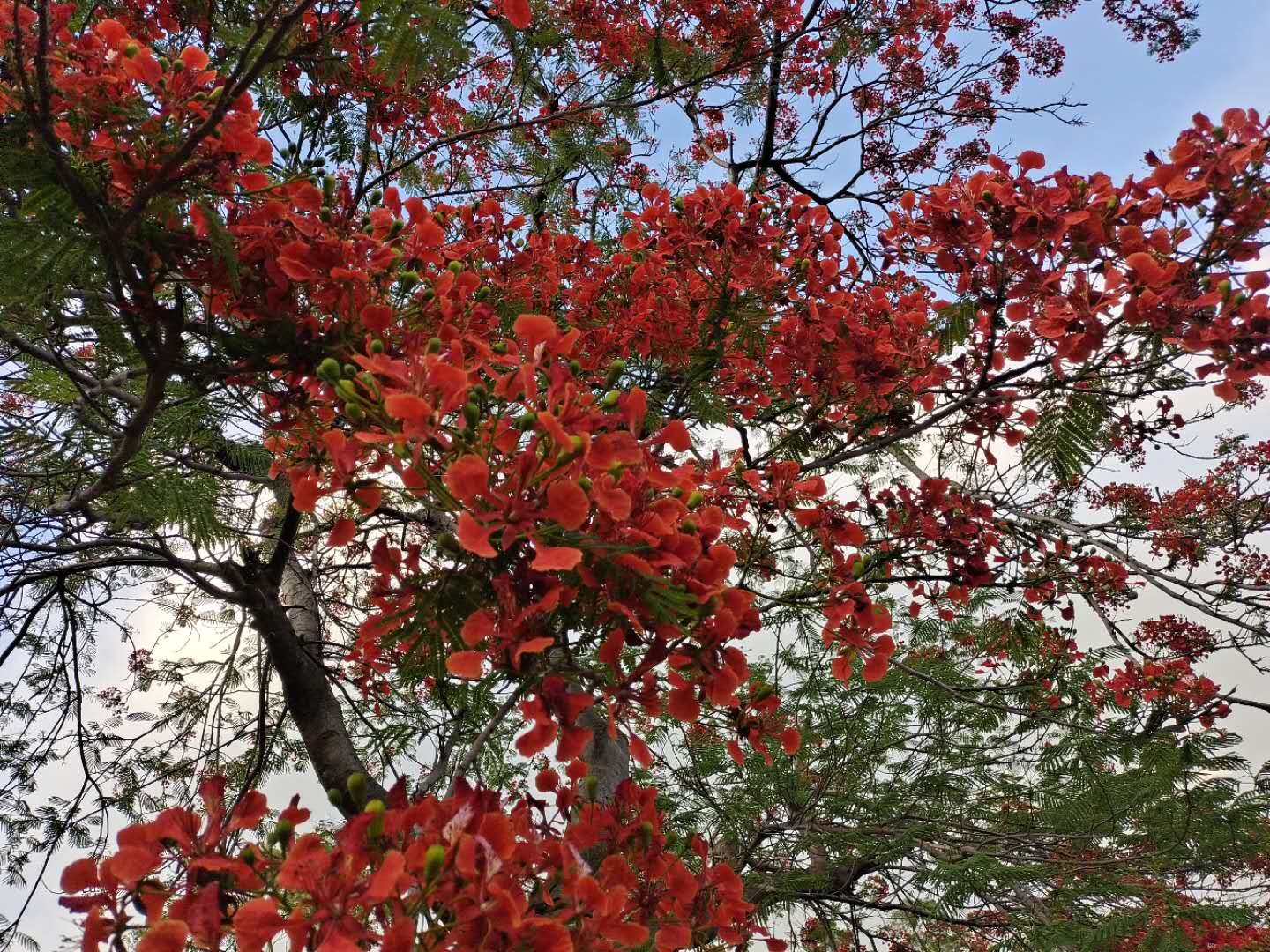 初闻凤凰花,只知其名不知其意。翻阅资料得知“叶如飞凰之羽,花若丹凤之冠”,别名金凤花、红花楹树、火树、洋楹等。夏季开花,花开满树怒放如火,其独特的形状,如同一个巨大宝盖,又如同一把张开的红色大罗伞,下垂的花枝,显得分外妖娆。