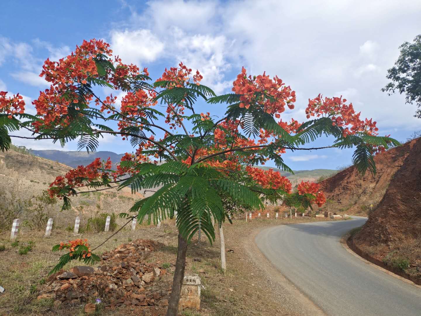 凤凰花,绝对是夏天的尤物,更是大自然对热区的专宠,在五月天如期绽放。不论你是久居红土大地之人,还是旅途邂逅之客,这满树红花与绿叶相映成趣的美景定会让你百看不厌,情不自禁驻足停留、饱览一树的妖娆。凤凰花生命力极其旺盛,耐干旱耐高温,正因如此,才足以在礼舍江畔沿江公路繁衍生息,继而打造“最美沿江公路”。
