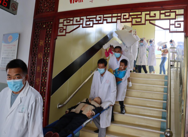 演练分三阶段进行:一是在地震发生时,如何正确避险、逃生和开展应急救援;二是发生火灾时如何疏散、逃生、救援及正确使用灭火器;三是由保安公司专业人员模拟恐怖分子带管制器械到医院袭击医务人员,被制服的场景。