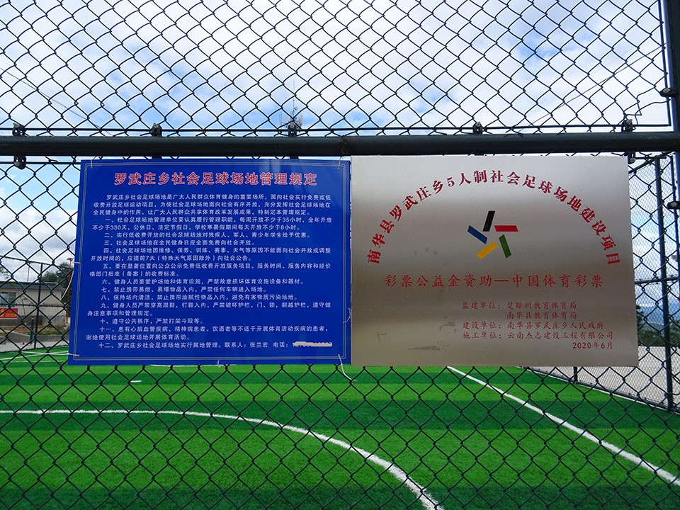 该工程位于罗武庄乡树密鲊村委会幸福新村,以基础场地平整夯实,配100mm碎石铺设,150mm厚C25混凝土浇筑,人工草坪面层,排水沟砌筑及灯光照明设施,按设计图纸和国家规范进行施工。工程总投资25万元,根据《2020年云南省社会足球场地设施建设补助方案》要求:省级补助20万元,州级补助5万元。采取施工方垫资建设方式,由云南杰志建设工程有限公司承建。