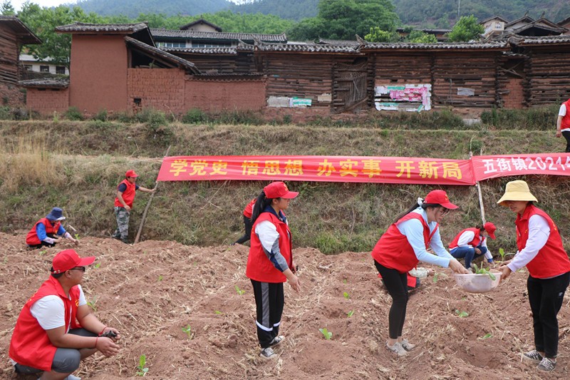 在田间地头,镇党委书记阿发剑一边指导春耕生产,一边为党员干部和群众讲红色故事,共同回顾党的光辉历程,让党和人民贴得更紧、走得更近。阿书记强调:现在正是春耕生产的关键时期,我们要把党史学习成效实际应用到群众工作中,转化为 为群众办实事、解难题中,真正做到关心关爱帮助群众。要学习革命先辈崇高精神,传承他们艰苦奋斗的精神,立足本职岗位,为民办真事、办实事,积极引导广大党员干部群众感党恩、听党话、跟党走,凝聚起团结奋战攻坚克难的蓬勃力量,干群联动,共建和美五街。