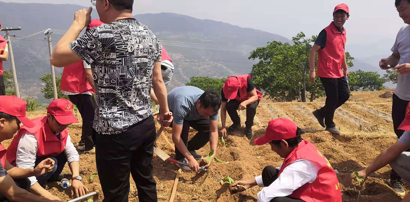在红土坡镇簪花村委会写字树村民小组200多亩的烤烟样板地里,一支身穿红马甲,头戴小红帽的“志愿服务队”先召开了烤烟移栽现场会议,进行移栽技术培训。随即开展“助农促春耕”活动,大家撸起袖子,弯着腰放苗、培土、浇水、盖膜,不顾炎炎烈日,忙得不亦乐乎。他们齐心协力,不偷懒躲懒,没多大会儿功夫,就把烟农陈宗平家两亩多的烟苗移栽完成了,虽然大家看起来一个个灰头土脸的,脸上却洋溢着灿烂的笑容。