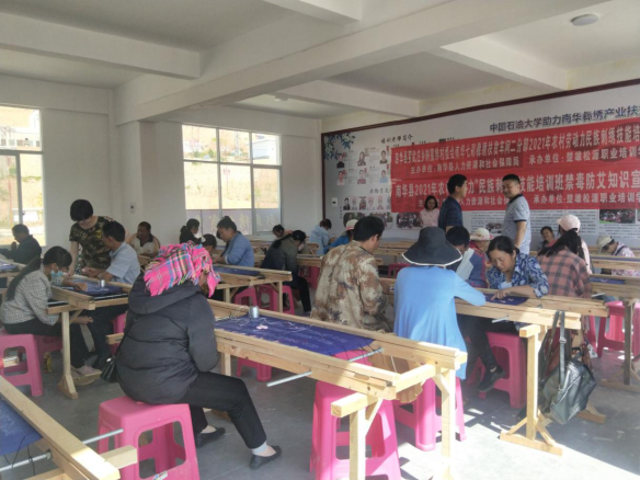 为有效推进罗武庄乡民族手工艺品和村集体产业有机融合,增强村集体经济发展的内生动力和造血功能,形成推动村集体经济发展、实现妇女群众稳定就业增收的整体合力,大力发展农村电商,4月20日,县人力资源和社会保障局、楚雄松源职业培训学校、罗武庄乡政府联合在罗武庄乡树密鲊村委会南华七彩彝绣扶贫车间二分部举办2021年农村劳动力民族刺绣培训班。