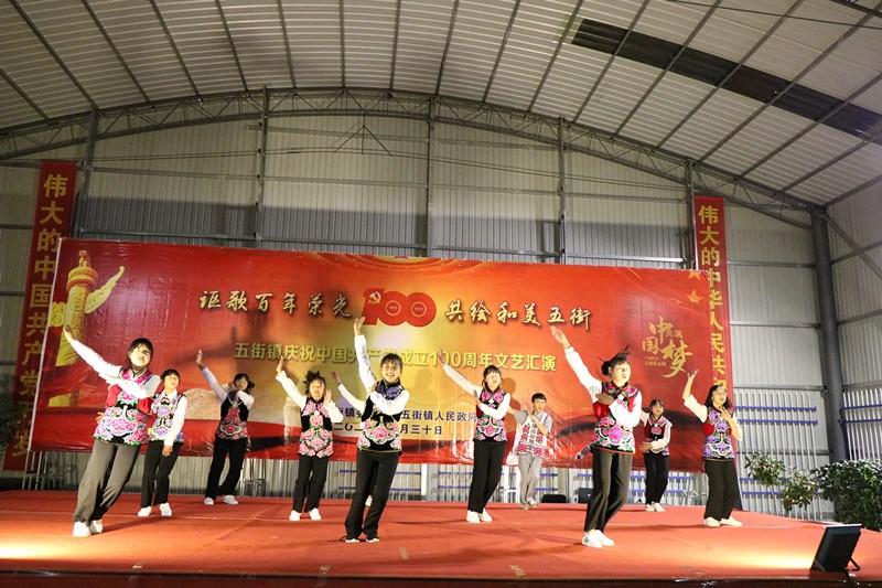 五街初级中学文艺队带来的舞蹈《红火五街》,展现了彝乡群众心声,是人民群众精神文化不断提升的标志。
