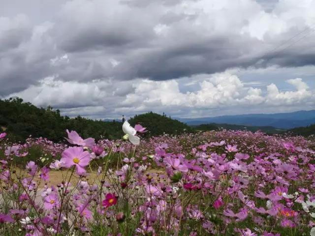 格桑花无疑是美丽的,随着季节更替,更会魔幻般地转变着自己美丽的容颜。夏天,身着素白的衣裳,如天降的仙子,随风飘逸,舞动着娇柔的躯体;秋天,换成了红妆,妩媚得如出嫁的新娘那般的可人,把七彩五街装扮得更加炫丽多姿。