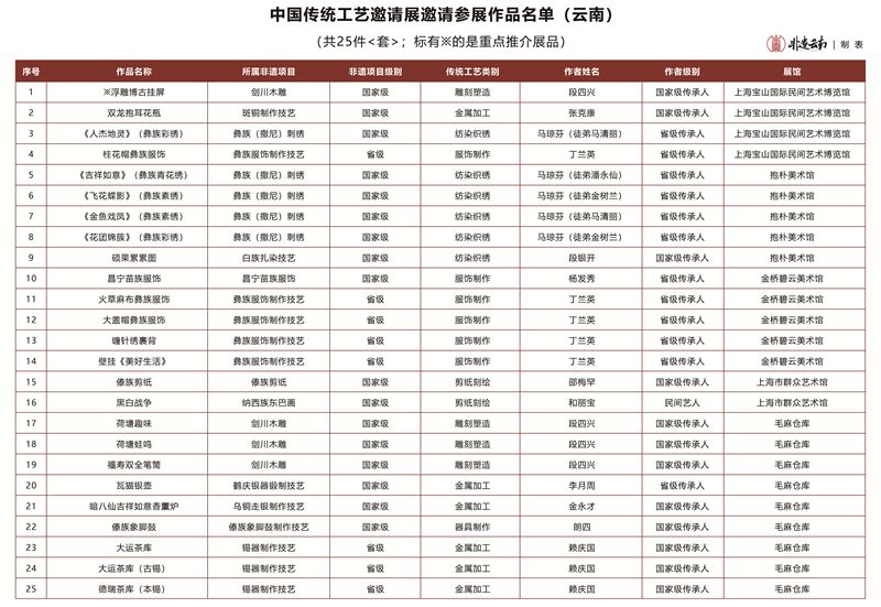 2021年初,文化和旅游部下发了“百年百艺·薪火相传”中国传统工艺邀请展作品征集工作的函,云南省各市(州)县文化和旅游部门积极推荐上报展品,组委会邀请专家学者组成专家委员会,对各地推荐的展品进行遴选,择优进行展览。