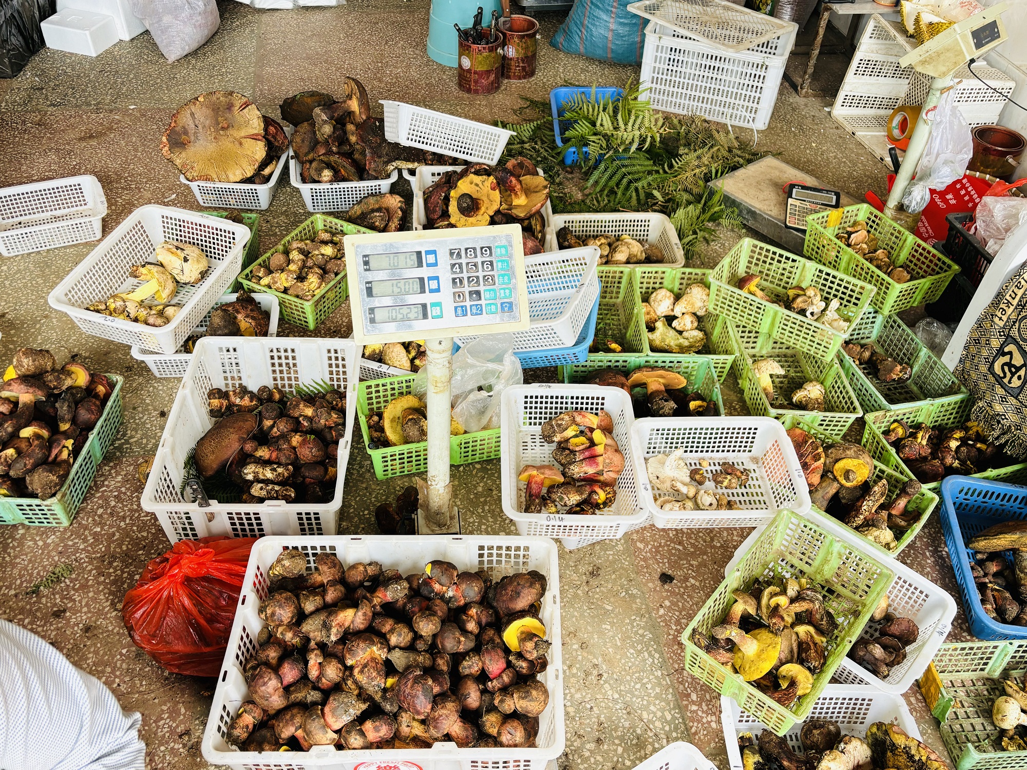 在五街镇野生菌收购商鲁有胜家,店里摆满了一筐一筐的葱菌。红葱颜色艳丽,菌杆是鲜红色过渡到鲜黄色,俗称“红见手”,菌香浓郁;紫葱颜色更为暗沉,带有独特的酸脆感;白葱看起来则是细嫩洁白,菌肉肥厚,味微酸而香甜。除了葱菌,还有少量青头菌,绿白相见的菌帽清新脱俗,惹人喜爱。