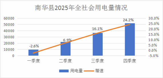 (一)由负转正,总量增速双突破。2025年,南华县全社会用电量累计52168.9万千瓦时,同比增长24.2%,较年初一季度负增长2.6%实现强势反转,增速高于全州17.7个百分点,创近三年来年度增速新高,彰显县域经济强劲复苏活力。