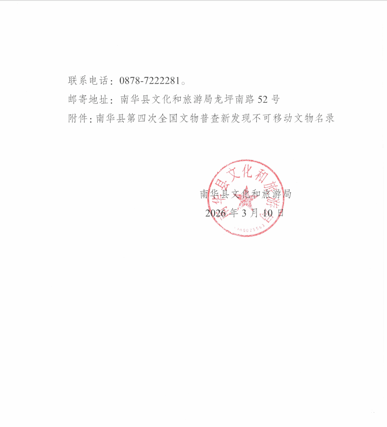 邮寄地址:南华县文化和旅游局龙坪南路52号