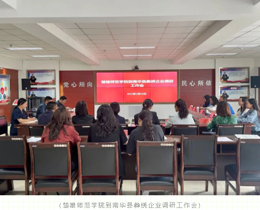 为进一步加强楚雄师范学院与南华县彝绣企业的合作办学和彝绣人才培养,2023年4月26日,楚雄师范学院美术与艺术设计学院党总支副书记、院长王新春一行到南华县调研彝绣产业发展、学生就业创业“返企脱岗”等工作。