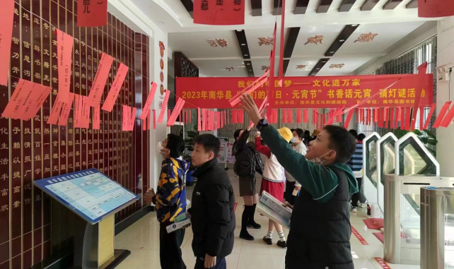 2月5日下午,在南华县图书馆举办了“书香话元宵·猜灯谜”活动,活动共悬挂灯谜500余条,谜题涵盖了党的二十大精神、社会主义核心价值观、成语故事、传统民俗、历史人物、百科知识等,内容既贴近生活,又充满文化色彩,既具娱乐性,又具知识性,幽默风趣又十分应景。活动现场,有的仰头读题,有的低头沉思,有的猜中答案手舞足蹈,欢欢喜喜地领取了小礼品。猜灯谜不仅领略了传统文化的魅力,也使自己的智慧得到启迪,现场洋溢着欢乐、祥和、喜庆的气氛。