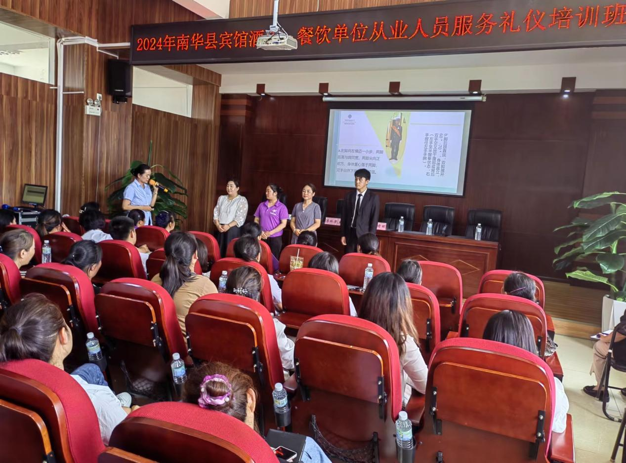 为进一步提高全县宾馆酒店、餐饮单位从业人员服务水平,强化服务意识,规范服务标准,有效推进我县宾馆住宿餐饮行业持续健康发展。2024年6月19日,县文化和旅游局在南华县图书馆4楼举办全县宾馆酒店餐饮单位从业人员服务礼仪培训班,全县宾馆酒店餐饮经营企业从业人员110余人参加了学习培训。